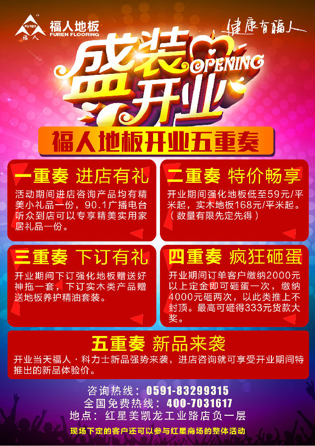 二重奏 特价畅享:开业期间强化地板低至59元/㎡起,实木地板168元/㎡起(数量有限,先定先得);