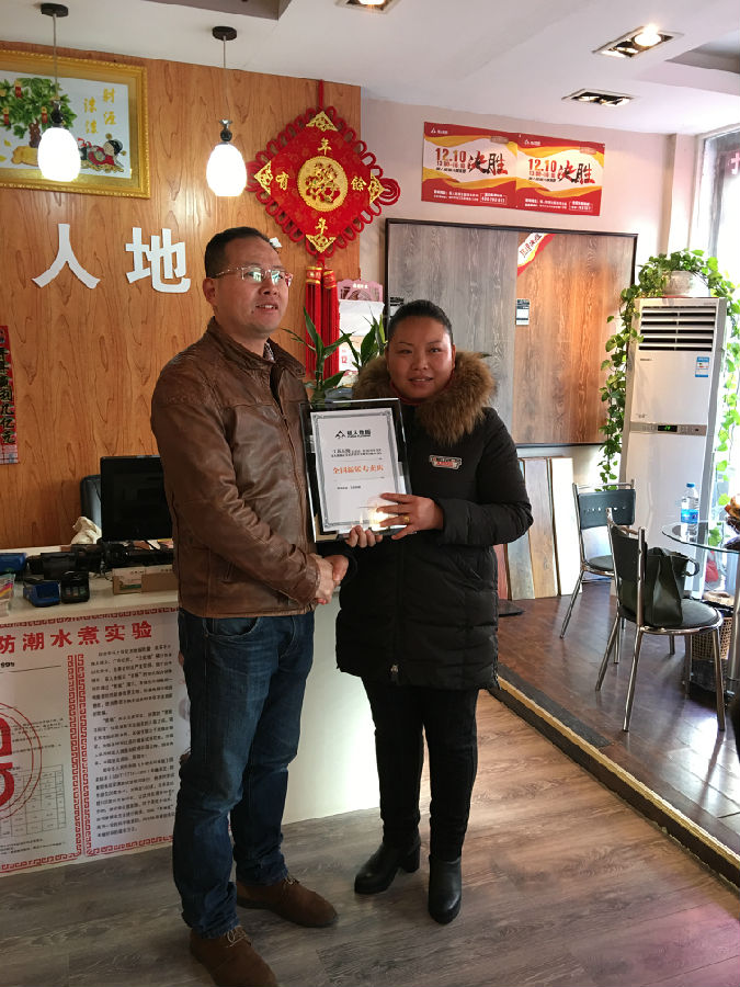 东海李总勤劳执着,品牌意识强,坚持品牌推广,新楼盘扫楼、水煮地板展示等,在短短3年时间里,在人口只有二三十万的小县城将九游会J9地板做得风生水起,销量步步高升,李总体现,2017年准备大干一场,让我们期待李总的再次腾飞。东海九游会J9荣获“全国新锐专卖店”荣誉称呼。