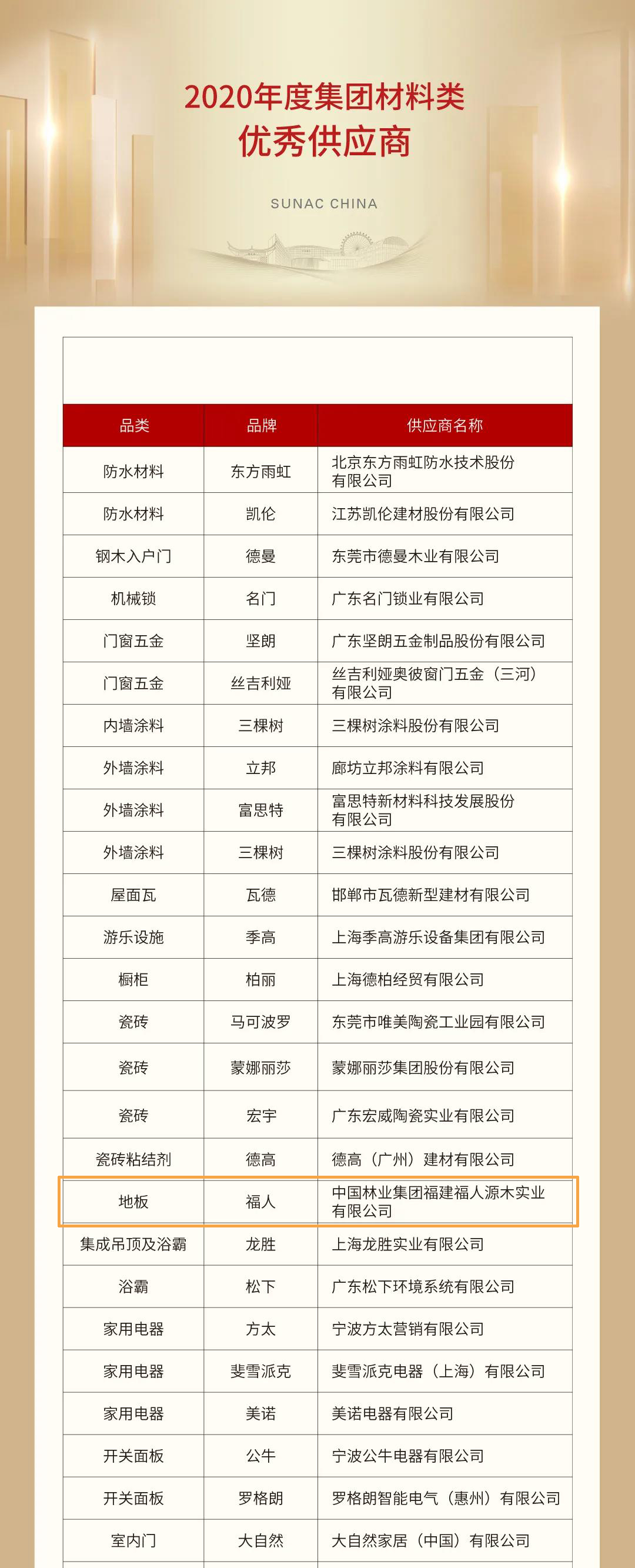 融创地产集团对外宣布2020年度优秀供应商名录